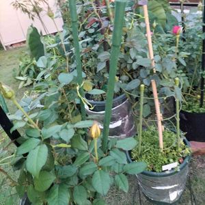 バラが、そろそろ咲きはじめています。新苗は咲かせないほうがいいという人もいますが、もう待てません。大苗より元気そう。