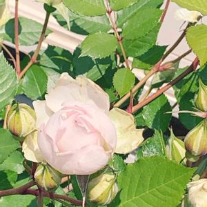 ずっと探してた斑入りの薔薇🌹をホームセンターで発見👀✨ お迎えしました😆✨ 1回目咲き終わってたので花殻を切り取り、一個だけ蕾が残ってたので開花楽しみです☺️💕