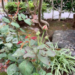 弱ってたバラ。こちらのアドバイスのお陰で🙇♀️やっと蕾🙇♀️ 雨に負けず、天まで昇れ!