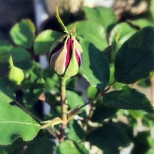 おはようございます^ ^ 休日の晴れた朝って、とても良い時間ですね。 水やりしたり、植物の様子を観察してるだけで、和みます。 バラ*フランシス・デュブリュイの1番はじめに咲きそうな蕾。