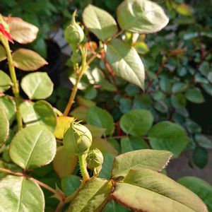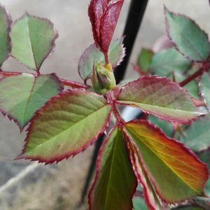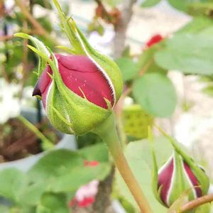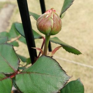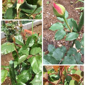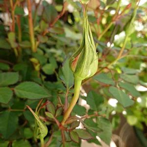 バラ*フランシス・デュブリュイ、 蕾が見えてきました^ ^🌹 もともと芽吹いていた苗、早咲き性ということもあってか。 蕾をつけるには、枝がまだ短い気もするので、なにかの間違いで、蕾をつけてしまったのか。 初めて育てるものは、不思議がいっぱいありますね^ ^;;