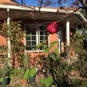 真っ赤なバラさん、寒いから開くのやめとこうかしら…な感じです。このままフリーズしちゃうかも❄️