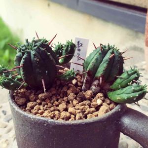 新入りさんの登場ですヾ(≧︎∇︎≦︎*)/ 行きつけのお花屋さんの夏休みが終わったので遊びに行ってみました🎶 見るだけね〜! なんて旦那様に言いながら… 久々で気持ちが緩んでしまったよ(^_^;) 気になったかわい子ちゃん♥︎︎∗︎*゚ ユーフォルビア亀キリン ユーフォルビア紅キリン サボテンみたいだけどサボテンじゃない… 不思議だね〜( ^ω^ ) 合わせて買ったカンカン(しゅうちゃん風 w)に、転写シールでアタシ流に少しだけお化粧して… 仲良くペアで植えてみました.。o(♡︎) *。.(♥︎´꒳`*)人(*´꒳`♥︎).。* ユーフォルビアは阿蘇キリンさんしかなかったけど、ユーフォルビアの魅力にハマってしまいそうだよ〜(灬♥︎ω♥︎灬) 一緒に写っているハートカズラのは 実家から少しだけ頂いて来た子^ ^ 緑の斑入りは元気にグングン延びるのに、ピンクの斑入りさんは成長が遅い(>_<) ピンクの斑入ちゃん可愛から頑張って大きくしたいぞ(๑•̀ㅂ•́)و グッ!