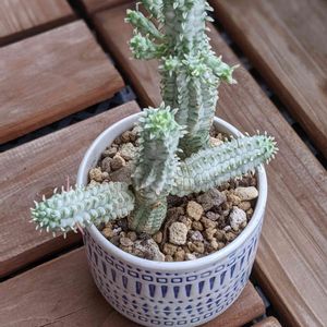 おはようございます😃 今日の1枚はユーフォルビア白樺キリンです🌵 白樺キリンは自立できなくて、垂れ下がるので、添え木で強引に立たせてます🪴 棚に飾るのでどうしても仕方なく😅