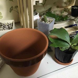 鉢のサイズに悩んでいます。 右端 直径8センチ程のDAISO素焼き鉢 真ん中 新入りビカクシダ 3寸ポット 左端 直径15センチ程のコーナン素焼き鉢 右は小さすぎるし左は大き過ぎる気がします。 DAISOに13センチがあったけど10センチが丁度いいような… 大きくするんだったら13か⁉︎と悩んでいます。 中にはバークチップ引いて水苔買いに行く予定です。 今日は土乾いてますが環境も変わった事だし、明日腰水予定です。