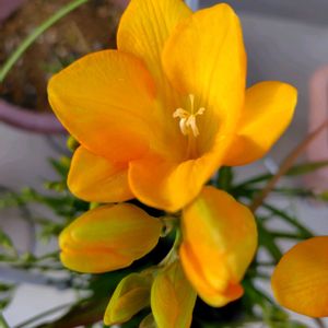 こんにちは😊 黄色のフリージアが咲きました💛 3色のうち第一号です✨ 顔を近づけるとあま〜い香りが🤗 大好きなお花です💕 白と紫も楽しみ🤍💜 4年目もたくさん咲いてほしいなぁ😆 今日も1日お疲れさまでした🥐
