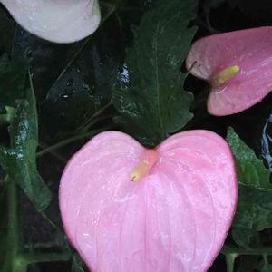 大雨🌁小雨🌧梅雨を思わせる ☔💧 台風🌀が来るのかな…… 庭先の花壇に自生したトマト🌿の日陰を利用して 置いておいた植木鉢 すっかり埋もれかけてる(・・;)💦 様子を気になってのぞいたら ツヤツヤ〜 💗💞😍 アンスリウムがこんにちは〜 同じ株から 白色🤍とピンク色💗