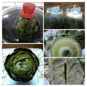 🌹苔野ミレのちゃちゃと食べたら〜もったいない〜🌹 アーティチョーク編 アーティチョークってのは最近流行りのヨーロッパの人にとってはなくてはならないおやつ的なもの。和名は朝鮮アザミって言うのよ。 栽培は二年かかかるし、図体がでっかい割に、食べるところが少ないから日本で栽培する人はすくないらしいの。 実物見たことがない人は勿論食べ方を知らないって人が多いってころころが言うからさぁ。簡単に説明するわね。 まず厄介なことに花びらにも似た堅いがくの真ん中に棘があるのよ。この棘をハサミですべて刈り込むの。 これを15ふん蒸す。皿に盛り付け、がくを一枚一枚剥がすと右上のようになるわよ。そうして付け根の部分を少しだけ囓じることが出来ちゃう。 味(*˘︶˘*).。.:*♡は里芋と百合根が好きな人はくせになるわよ。 がくを全て取り外し、付け根を噛じると右真ん中の毛むくじゃらになるわね。 この繊維状のものは後々は綺麗な花になる部分で食べられません。これを全て剥ぎ取ります。 さあ右下をみてよ。これが食べられるのよ〜。筍も真っ青の見事な脱ぎっぷり。たったこれだけを食べるために、二年かけて栽培したと思うと泣けてくるわね。 DAIGOちゃん。これをどう言うの?言ってご覧!! J.G.D(じっと我慢のDAIGOです)