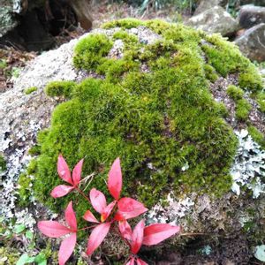 我輩は苔である。名前はまだない。(盗作の可能性ありやなしや?) 行方知れずの親の名はホソバとか? 山の彼方の空遠く幸い住むと人は言うらしいが、我輩は苔であるからして…。 この年になっても親が恋しい苔心。 なぐさめは去年から近所にすむ南天むすめ。岩の間から顔を出し、とうとう赤く色づいた。成長をみまもるのが我輩の役目と心得る。