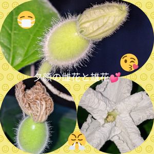 夕顔の雄花きれいでしょう💕 🐗は夕顔はとんとご存知ないのか? 他は全滅なのに、やっとこさ5株残りました((o(´∀`)o))ワクワク 夕顔の花は、雄花ばかりで、夜中から咲き始めるそうな…。 朝5時に起きて、なんと2つほど雌花をみつけました……(*˘︶˘*).。.:*♡ 早起きして、寝ぼけ眼でパジャマのまま撮影しましたよ。 受粉し忘れた左下に喝を入れ、こじ開けようか?迷いましたが、自然のなせる技に期待します。 朝早くから、蚊にさされ、虫媒花に蚊がお役に立つかわかりませんが、虫が朝早くから活動している事を確認して(๑•̀ㅂ•́)و✧と致しました(;´д`)トホホ…💕 夕顔は花や雌花の可愛らしい姿とは対照的になかなかの大物(馬面)に生りますよ。 のり巻きの干瓢に、干すとなります。 私は冬瓜のように、出汁たっぷりでコトコト煮ます。 挽き肉で餡かけにすると絶品です💕 私にとっては、冬瓜よりも美味しい…と朝5時に…猪に聞こえぬように、小さい声で申しました。 聞いちょるか?