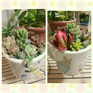 職場の仲良しさんに作った寄せ植え 白い鉢を渡されたので転写シールでリメーク 🐰年生まれ、優しいママさんなのでこんな鉢に。 喜んでくれるかな? 半分はらん展のカクトコロさんのミニ多肉です