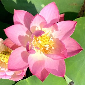 ハス「寿星桃」2番花2日目。先日のお昼はギュッと桃になってました♪ 小さくても華やかでキュートな花ですね!本日は蜀紅蓮とのツーショットですが高低差ありすぎてしゃがんで撮りました(笑) (*´ω`*)
