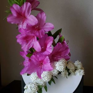 自由花 2つ目(正確にはこちらが先に出来た方) こちらは家の植物のみ 使用:グラジオラス 深海、半夏生、泰山木