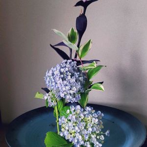 水盤の先の花が枯れたので花を入れ替え(※写真上げ直し。先の写真にいいね押して頂きありがとうございます) 使用:紫陽花、石蕗