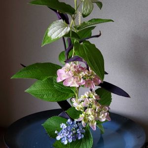 使用:半夏生、紫御殿、紫陽花 前回水盤に入れた紫陽花が萎れてきたので入れ替え。生ける為に育てているのもあるけど、庭の花を見ながら組み合わせを考えるのは楽しい