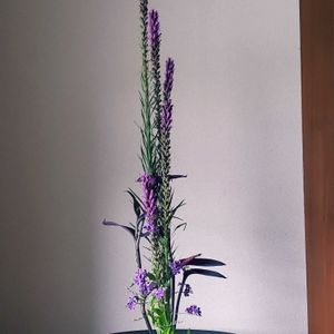 水盤入れ替え リアトリス以外は庭の花を使用 使用:リアトリス・紫御殿・デュランタ宝塚
