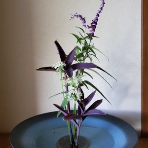 使用:ヤブラン(花・葉)、紫御殿 暑さも落ち着いたので水盤にも庭の花を立ててみる…イメージは秋らしく?