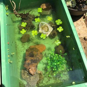 我が家第3のビオトープ?完成かな? ついうっかりウォータークローバー買ったけど、別の草も入ってる♪ 食虫植物もいろいろあってつい買いそうになったよ(^^;