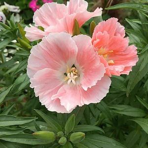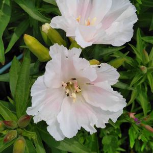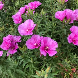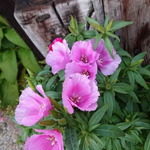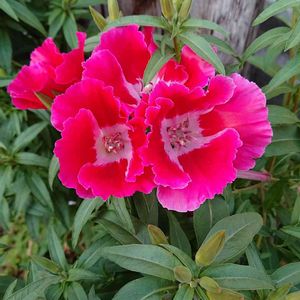 今日はどんよりと曇り 天気は下り坂です 近くの花壇で1番華やかなお花でこの曇りを吹き飛ばしてほしいです💕🎵🎶 ゴデチア ゴデチャまみりんさん としこさんが教えてくださいました🎵🎶🤗