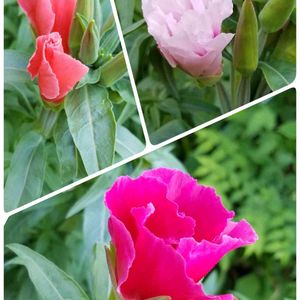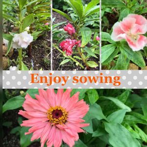 こんばんは 種まきしたお花たちが咲き始めています。 左上から、*ホウセンカ、2色 *ゴデチャ 下*ジニア 晴れたらいいのにね。