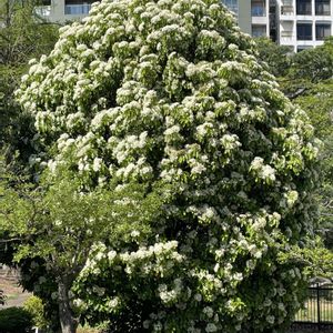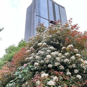 おはようございます 日比谷散歩 日比谷公園を出ると大きな🤍オオカナメモチでしょうか白い花がたくさん咲いてます 奥は東京ミッドタウン日比谷です