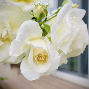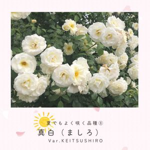 夏でもよく咲く品種⑧ - 真白(ましろ)- 2023年発表された真白(ましろ)は トゲが少ない四季咲き性のつるバラです。 枝がしなやかで誘引しやすく、 低いフェンスなど ご家庭でさまざまな楽しみ方ができます。 耐暑性や耐病性に優れているので とても育てやすいです。 優しい白色の花が密集して 春から秋までよく咲き続けます。 咲きはじめはやや高芯で格調高く、 開いてくると可愛らしい印象に変化します。
