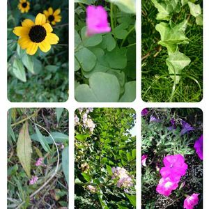 学友宅に行き穂になった青じそと青い柚子のお裾分けを受け取りに 庭の中に咲いてる植物達 時計回りに説明しますね 黄色いルドベキア?みたいな花 ピンク色のカタバミ? アイビー?ヘデラ? 芝生の間から 延びてた ペチュニア? 木の高いところに咲くサルスベリ? この子はだあれ❔❔ イヌタデじゃないかと後日判明 左上のルドベキア?かも。の葉と家の鉢植えに生えてきた葉が、一致して名前が解り 開花が待ち通しい~🎶 (以前黒色の種子らしきものを土に埋めたから発芽した様なの)