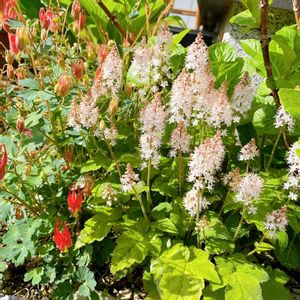 おはようございます✋😊🌅 ⬆️2年前から、水やり以外放ったらかししていたら大きくなりました🤗💓 ⬇️我が家では、オダマキの種類の中で1番早く咲くリトルランタンサンが咲きました🤗💓 株分けしたタイ釣り草サンとパシャ📷✨ 右端のリトルランタンさんは2年前の零れ種です😊