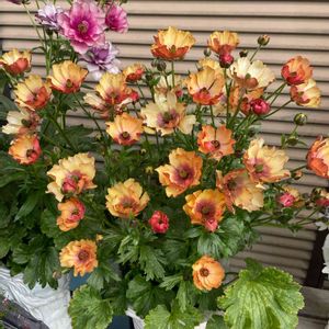 おはようございます🎵 今年お迎えしたラナンキュラスラックスのウラノスさんが沢山咲いてきました~✨買った時に咲いていた花より少し小ぶりなのが逆に可愛い😍一重だったり八重だったり色々咲いてます🎶 花が終わったらこの場所に地植え予定😁今は鉢増ししてありますが既に根っこが底から出てる🤣やっぱり小さかったか😂 花と多肉と並べて置ける貴重な季節😍思う存分楽しみます🤣