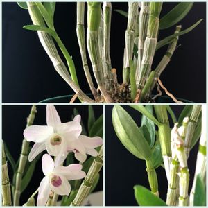 🌱デンドロの新芽🌱 開花中のみこちゃんに新芽🌱🌱🌱 蕾も(右下)これは咲くのかな? 🏷魅惑のデンドロビウム