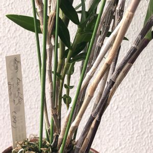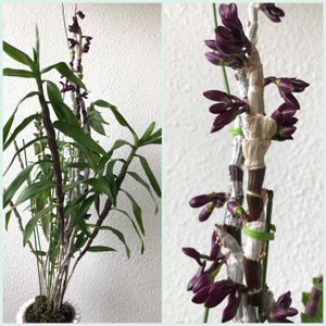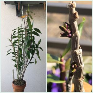 💜デンドロビウム クニコ"ジュン"💜 蕾が出ています✨ ○左)株姿。新バルブは緑色💚→成熟すると紫色に💜 →そして落葉します🍂 ○右)落葉したバルブから出た蕾の塊。 🏷魅惑のデンドロビウム
