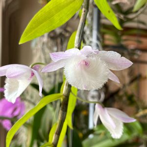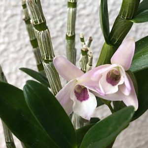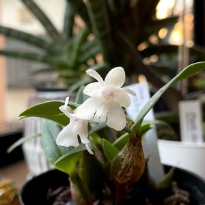 🤍みこちゃん🤍 今年1月に4輪咲いたみこちゃん。 草丈15センチくらいの小型のデンドロビウム。 さらに2輪咲きました✨ 昨年1月のサンシャイン蘭展で購入した4株の内、 一番咲いてくれます。 🏷魅惑のデンドロビウム