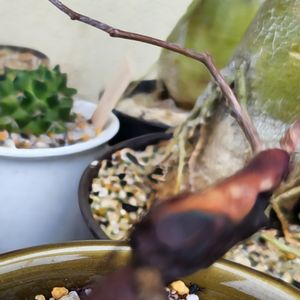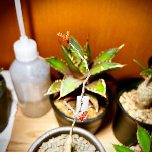 今年、引越しをしました。そして植物にとって最もいい環境を!と奮闘しておりましたところ、ようやくお休みしていたコーデックス類がお目覚めに。実生からの個体は根が枯れて居ないか心配でしたが、何とか無事に冬を越してくれて良かったと安堵していたところ……おや?と。今まで見た事ない物がパキプスの枝に付いている。虫か?とも思ったけど、様子がおかしい。枝の節に出来ていて、病気かなぁとか思ってたら、何とお花でした。え、そこに咲くの?!てか小さいとは聞いてたけど控えめすぎて蕾とかわからなかったよ! 我が家に来て4年目?だったかな。可愛い控えめな花を咲かせてくれて嬉しいやら病気かもしれないと心配した日々が複雑やらで……まぁ、雌雄どちらかの個体かは見分けてませんが、この環境が気に入ってくれたのなら良かった。