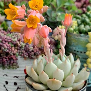 タニ友さんから 段ボールにぎっしり詰まった 素敵便が到着🚛💨 開けた途端に溢れ出し、 まるでお伽話の玉手箱のよう🎁 その数、鉢植えのセダム1種、 大量のブラウンシア1種、 グラプトベリアの錦1種、 韓国苗を含めたエケベリア4種、 センペルビウム13種の、 何と合計20種類Σ(Д゚;/)/✨ 目新しい韓国コスメに💄、 ニャンコのオヤツまで😸 GSを通した繋がりに感謝です タミニクチャン、コノオレイハバイガエシデ(*^-^) いただいた素晴らしい多肉を ご紹介させて下さいね 🦋【スエンデルマニー】 Sedum dasyphyllum var.suendermanii 流通名 玉蛋白 🐟【マキシミリアニ】 Braunsia maximiliani 和名 碧魚連・碧魚蓮(ヘキギョレン) 🌈【ティテュバンス バリエガータ】 Graptoveria 'Titubans' f. variegata 流通名 アプリコット美人 🌱【エボニー×レモンベリー】 Echeveria agavoides 'Evony'×Echeveria 'Lemonberry' 🌱【ティッピー】 Echeveria 'Tippy' 別名 テイピ 🌱【野ばらの精】 Echeveria 'Nobara-no-sei' 🇰🇷【ヤンジン】(韓国苗) Echeveria 'Yangjin' 別名 フィンチ 🌵【ヒューフェリー ブロンズ キング】 Sempervivum heuffelii 'Bronze King' 🌹【アラクノイデウム】 Sempervivum arachnoideum 和名 巻絹 🌹【アロンディナ】 Sempervivum 'Arondina' 🌹【コラージュ】 Sempervivum 'Collage' 🌹【ジャンヌ ダルク】 Sempervivum 'Jeanne D'Arc' 仏名 Sempervivum 'Jeanne Darc' 米名 Sempervivum 'Joan of Arc' 🌹【ストロベリー ベルベット】 Sempervivum 'Strowberry Velvet' 🌹【テクトラム トリステ】 Sempervivum tectorum 'Triste' 🌹【ディズニー フェスティバル】 Sempervivum 'Disney Festival' 🌹【パシフィック ビューティー】 Sempervivum 'Pacific Beauty' 🌹【パシフィック ブルー アイス】 Sempervivum 'Pacific Blue Ice' 🌹【パシフィック レッド タイト】 Sempervivum 'Pacific Red Tide' 🌹【ファイヤー バード】 Sempervivum 'Fire Bird' 🌹【SPN-6】 Sempervivum 'SPN-6'