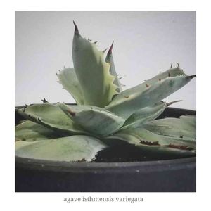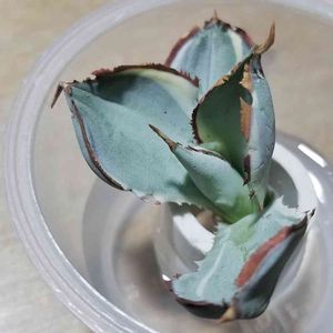 容姿端麗‼️ 久々の新入りアガベです。まだ小さいですがパウダーの乗ったブルーグレーの葉色に白斑、赤い連棘が美しすぎます❗️ 札の記載もすごかったです👇 Agave Isthmensis Dwarf Variegata 超特選肉厚甲蟹白斑 (W9cm)