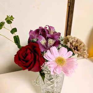 今日のお花 •ᴗ•✿ うちのガーベラは蕾なので、この前お世話になっているかたに送ったミニブーケのpicです( ⁎ᵕᴗᵕ⁎ )♡ ピンクのガーベラと紫のアルストロメリア、赤い薔薇とニュアンスカラーなカーネーションのブーケです🎀