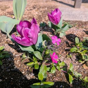 こんにちは😊 今日はいいお天気なのに風が強いです🍃 外出先で見かけたチューリップとシレネかな?紫も綺麗ですね✧︎*。 白いチューリップはそろそろ終わりそうです(՞ . .՞)" 透明感が素敵ෆ˚*