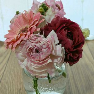 咲いているラナンキュラス、ガーベラ、金魚草をチョキチョキ✂して切り花にしました💐 ベース代わりに使ってるのは、りんごジュースの瓶🍎