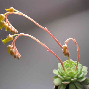 イリアも春。3本も花芽を伸ばし、黄色の小花を7〜8つ付 けて。 この花姿、咲き終えた月美人さんにソックリ。ということは、長〜く楽しめそう。ただ、できればしっかり自立して咲いてくれー。