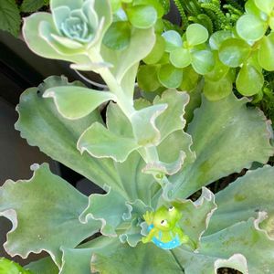 おはようございます(^O^☆♪ 今日明日は晴れ予報 26度 暑くなりそうですね💦 💚3年ぐらい見てるだけの大きい組さん💚 ⬆️葉牡丹みたいなエケベリア・高砂の翁 葉が硬くバリバリしていますよ😂 下葉がカリカリになったら外すぐらい😅 ↙️ ベンケイソウ科クラッスラ属の神刀 40㌢ぐらい育つらしいけど、まだ20㌢ この子のお花は可愛いんですよ❤️ ↘️ ベンケイソウ科コチレドン属 紅覆輪 この子もこんなに伸ばしたらダメ🙅♀️よね あたまから二股になってきました💦 タヌキさんもビックリ‼️ ただただ見てるだけの放置さんだけど 雨風太陽の恵みを受けて頑張って育ってくれています🎶