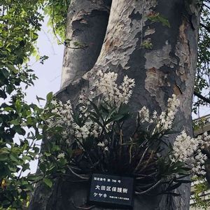 セッコク…日本🇯🇵、中国🇨🇳 ラン目 ラン科 セッコク亜科 着生植物 大きなケヤキの幹に着生して、バランス良くきれいな白い花を咲かせています。