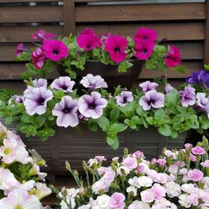 今朝のお花たち🌸 2段鉢のサフィニアたちも 垂れてきました