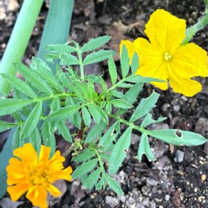 おはよう御座います😃 キュウリ❣️とマリーゴールド❣️ そしてネギ 早く、キュウリの各麹漬け食べたいな 😊
