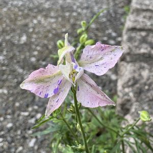 千鳥草 こぼれ種が発芽 玄関のコンクリートの割れ目、丁度階段の真ん中なので伸びては先が折れて、又折れてですが花が咲きました 昨年の植木鉢の花よりかなり小ぶり 可愛いのですが、つい水遣りホースが当たって折れてしまいた