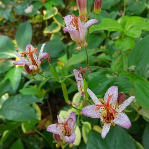 🌳木の花(葉っぱ)たち  その99    サルトリイバラ(猿捕茨) 🐒🦜🌹 サルトリイバラがある場所を教えて頂き、 行ってみました。 葉っぱだけでしたが、お初に見られて嬉しい。 日陰だと、開花、結実は難しいそうです。 雄株なのか、雌株なのか…😑 今回、調べていてわかったのですが、 サルトリイバラ=サンキライだったとは驚きでした。 花言葉は「不屈の精神」 植物の強さに因んでいるのだそう。 俗言に「山で恐いはサルトリイバラ、里で恐いは人の口」というらしいです。 ん?あら、私の口も???💋✨🙀キャー     皆さま楽しい月曜日を♡   🌤 *・゜゚・*:.。..。.:*・'🍁✨・*:.。. .。.:*・゜゚・* ⌘ メモ ⌘ 🔸科名・属名   サルトリイバラ科(シオデ科) シオデ属 🔸学名   Smilax china 🔸英名   Sarutori-ibara   China root 🔸別名   サンキライ   サルトリ   サンゲラ   ガンタチイバラ   カカラ…九州南部   イビツ   ノゲイハ   カラタチ   カカラン   サンキラ、グイ、ダンガメ(スッポンのこと)                …岡山県   ※地方名が沢山あるようです。 🔸由来  ❇︎サルトリイバラ   正に「猿捕り茨」。   サルトリイバラの茂みにサルを追い込むと、   トゲが引っ掛かって身動きが取れなくなり、容易に   捕えることができるとの意味。   実際はどうなのかは疑問。  ❇︎サンキライ   漢字表記は「山帰来」であるが、梅毒を患って   村を追われた男が、この薬草で治り、村に帰って   きたという故事に由来するという説と、山の珍   しい食糧を包む葉を意味する「山奇粮   (さんきろう)」が転訛したとする説がある。 🔸原産地と分布   日本  中国  朝鮮半島     台湾から東南アジアにまで分布 🔸花期   4月~5月頃 🔸花色   黄色 🔸特徴   日本全国の日当たりの良い山野に生育する   蔓性落葉低木。雌雄異株。   葉柄部分から出る2本の巻きひげで他の植物に   しがみつくようにして成長する。   葉は直径3~12cmほどになる円形で、質は厚く、   全縁(縁にギザギザがない)、両面無毛。   茎にはまばらに鋭いトゲがあり(個体差があり、   ほとんどない個体もある)、葉が着いた部分ごと   に折れ曲がってジグザグになっている。   花は葉の付け根の部分から散形花序を出し、   淡黄緑色の花を多数咲かせる。   果実は液果で、晩秋に鮮やかな赤色に熟す。   熟したばかりの時には食べることもできるが   (甘くはなく酸味が少々)、時期が遅くなると、   乾燥してしまって中は種子ばかりになる。鳥などに   食べられなければ落葉後もつるに残るため、   生け花、クリスマスリースの飾りなどにも使われ   る。果実の中にはあずき色をした直径1cm弱の   種子が5~6個入っている。   従来の分類体系(新エングラー分類体系)では、   ユリ科とされていたが、形態的に他のユリ科とは   異なる部分が多く、遺伝的な解析結果を反映した   新しい分類体系(APG分類体系)では、ユリ科   からは独立してサルトリイバラ科とされている。 🔸用途  ① 西日本では「サンキラ」と称し、カシワやホオノキ   と同じように塩漬けした葉を饅頭や餅を包むのに   用いる。これに由来する地方名「マンジュッパ」   「ボタモチバラ」「カシワ」が知られる。また、   岡山県周辺では、「しば(柴)餅」とも呼ばれる。  ② 生薬名「菝葜(ばっかつ)」(植物名:和山帰来…   サルトリイバラのこと)   根茎は地上のツルと同様によく育って木質化し、   節の多い独特の形状になる。サポニンやタンニン   が含まれ、秋に採取したものを乾燥させれば漢方   薬になる。ニキビ、腫物、むくみ、利尿などに   効果が期待されるが、実際にはさほどの効き目が    ない。  ③生薬名「土茯苓(どぶくりょう)」   (植物名:ナメラサンキライ S. glabra )   排膿・利尿・駆梅薬などに用いる。 🔸品種  ①近縁種に園芸種として流通している、葉の小さな   ヒメカカラ Smilax biflora がある。ヒメカカラの   自然分布が屋久島から奄美諸島に見られる。  ②ハマサルトリイバラ   暖帯南部から亜熱帯に見られる。似たような性質   を持つが、刺がほとんどない。 ③オキナワサルトリイバラなど全7種類ある。 🔸その他   ルリタテハの食草🐛🍃          (参照 重井薬用植物園 他)