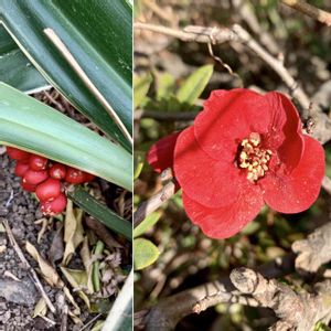 早くも2月。私の散歩道の道際等の草花達は、まだ冬の時期に耐えながらジッと次の時季を待ち焦がれているようだ--- 1月からの、進む時候の移りに観る草花の姿、姿---その2。 真っ赤な、花のカンボケと実のオモト。 ---自宅から外に出る。出た直ぐオープンスペースに目が行く。真っ赤な草花が飛びこんできた。 そして、近くのあるオープンガーデンへ。今は、間近の時季に向けて草花達への誘引中。分厚い鎧のような葉の下に、ひっそりと身をかばうよう様に、真っ赤な実がそこに。 それは、少し暖かな冬の昼下がりだった。 ・オモト<万年青>(キジカクシ科) 中国から日本の暖かい山地に自生する。日本では関東から沖縄にかけての山地、特に西日本に多く自生状態で生育し、観葉植物としても鉢植えで栽培される。古典園芸植物の一つ。 <歴史> この栽培の歴史は三百数十年とも四百年以上とも言われ、古くは徳川家康が江戸城へ入る時、家臣の中には万年青を献上したも伝えられる。 江戸時代は主に大名のもとで栽培が行われ、元禄から享保年間の書物には斑入りの万年青が掲載されたものがある。 このころより、栽培がある程度は一般庶民にも広がったようであり、文化文政のころには、縞や矮性のものも栽培されるようになり、その一部は利殖の対象となった <特徴> 革質の分厚い針のような形の葉が根元から生え、40 cm ほどの大きさに育つ。 夏ごろ葉の間から花茎を伸ばし淡い黄緑の小さな花を円筒状に密生させる。秋ごろにつく実は赤く艶のある液果で鳥が好む。 赤い実と緑の葉の対照が愛され、俳諧では秋の季語。観賞用としても古くから栽培され、江戸中期に日本で爆発的に流行し、斑が入ったものや覆輪のあるものなどさまざまな種類が作出された。これらの品種を含む古典園芸植物としての万年青(おもと)は現在も多くの品種が栽培されている。 <芸> 芸とは、万年青における葉の状態や葉姿、柄などの特徴の総称をいう用語。万年青に見られるさまざまな観賞点(詳細は省略)を持つ。 (出典・参考; オモト Wikipedia) ・ボケ/カンボケ<木瓜/寒木瓜>(バラ科) (備忘: ボケ/カンボケの属性等 12/29 ’20)