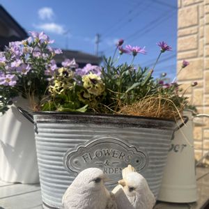 🏷️土曜はお空の発表会 参加します🤗 今日は2種類の寄せ植え💕 ⭐️ブラキカム ブラスコバイオレット💓空に向かって伸びてく先に可愛いお花を付ける🌱 ⭐️ファシナンテ 黄色🟡と濃い紫🟣の、フリフリで、焦げた卵焼きの様な色のお花💞 この色合いと空の青🟦がまた映える💖✨✨ 今日も1日皆様にとって素敵な日になります様に🥰💕✨✨