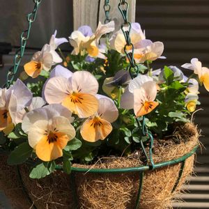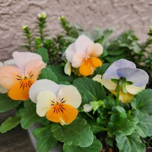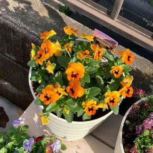 ビオラカルフォルニアコレクション。 カルフォルニアの夕焼けをイメージしているらしく、夕日のオレンジとほんのり入っている青が素敵。 日陰だけど、ずっと咲き続けてくれています。