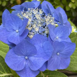 コアジサイ 林の中で咲き始めた美しく青きドヨウ🏷💙 10個ある雄しべの半分は、花弁に埋まるように内側に曲がっていて、しだいに全体が伸びて青い花火となる˗ˋˏ❊ˎˊ˗ 装飾花がないだけにかえって花糸の青や葯が目立ち、薄暗い林の中で煙るように際立つ🔵 花弁や雄しべが落ちると、大きく開いた花柱が残り、秋にかけてゆっくりと実を膨らませていく◎ 新しく伸びた紫がかった葉柄から葉脈にかけても、昨シーズンの実を付けた枝にも、粗い毛が生えているのがみえた(ノ)・ω・(ヾ)