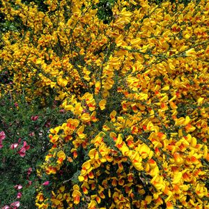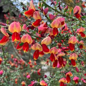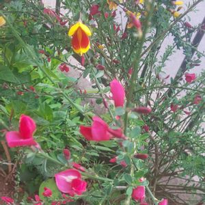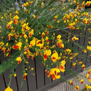 ご近所のお宅の庭で、素敵なエニシダが咲いてます❣ こぼれ種で、あちこち赤や黄色のエニシダが咲いていて、 風に揺れてる姿も、美しく存在感があり、思わずパチリ♥️